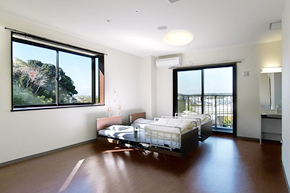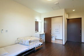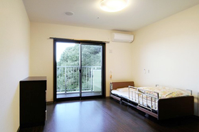 お部屋には、介護用ベッド、寝具、ナースコール、カーテン、トイレ、洗面所、収納家具、バルコニーを用意しております。